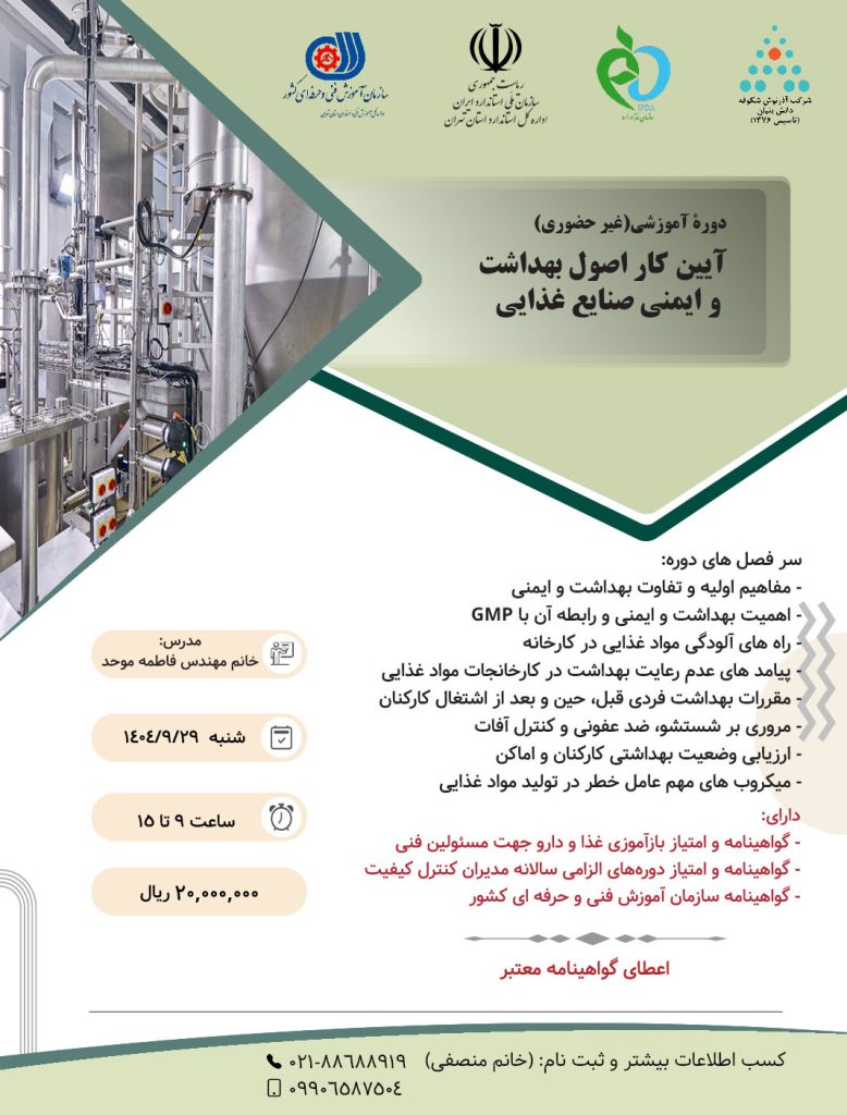 شرکت آذرنوش شکوفه بعنوان اولین تولید کننده ایرانی امولسیفایرها و مواد بهبود دهنده هاي نان و شیرینی ( کیک، بیسکوئیت، کلوچه و ویفر) با استقرار استاندارد مدیریت کیفیت ایزو 9001 (بازنگری سال 2015) ، استاندارد ایمنی غذایی ایزو 22000 (بازنگری سال 2018) و سیستم HACCP (بازنگری سال 2003) در راستای ارتقاء سیستم های مدیریت کیفیت و ایمنی غذایی خود گام برمی دارد. بیشتر…